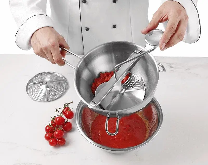 Optimal für das Zubereiten von Cremesuppen und Soßen. Mit 2 Einsätzen (⌀140mm), grob und fein.