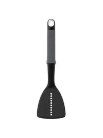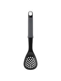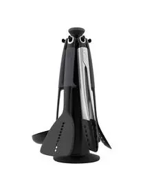 Das siebenteilige Set besteht aus je einer Zange, Pfannenwender, Schaumlöffel, Schöpfkelle, Kochlöffel, gelochten Pfannenwender und Ständer mit einer rutschfesten Unterseite.