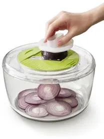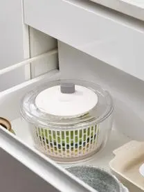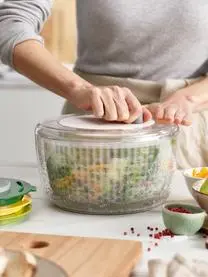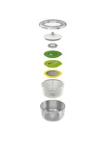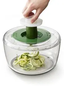 Dieses Salatzubereitungs-Set besteht aus vier austauschbaren Scheiben für verschiedene Aufgaben: Salatzubereitung, Salatschleudern, Spiralschneiden, Reiben und Schneiden. Legen Sie die farblich gekennzeichnete Scheibe für die gewünschte Aufgabe in den Deckel ein, und schon kann es losgehen. Es wird mit einem praktischen Fingerschutz geliefert, der die Spiralschneide- und Schneidefunktionen sicherer macht und zeichnet sich durch eine rutschfeste Unterlage aus.