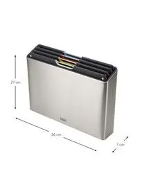 Dieses Set enthält vier farbcodierte Schneidebretter, die in ihrem schlanken Gehäuse schön organisiert aufbewahrt werden können. Die doppelseitige Platten mit messerfreundlichen, strukturierten Schneidflächen verfügen über rutschfeste Füße.
