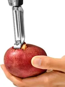 – Die gezackte Klinge bleibt scharf und lässt sich schwenken, um mühelos durch festes Obst und Gemüse zu gleiten.